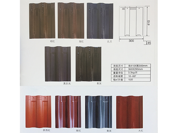 名稱:陶瓷彩瓦 顏色:玫紅、孔綠、孔藍(lán)、硒紅、深青灰、青灰、亞光、灰藍(lán)等(可定制顏色) 尺寸:370*250mm 405*270mm 厚:10mm 每平米用量:14片 鋪貼方式:水泥屋面鋪貼,木、鋼結(jié)構(gòu)干掛都可以 吸水率 : <6% 抗凍性能:-25 產(chǎn)地:江蘇宜興市丁蜀 安徽宣城廣德縣