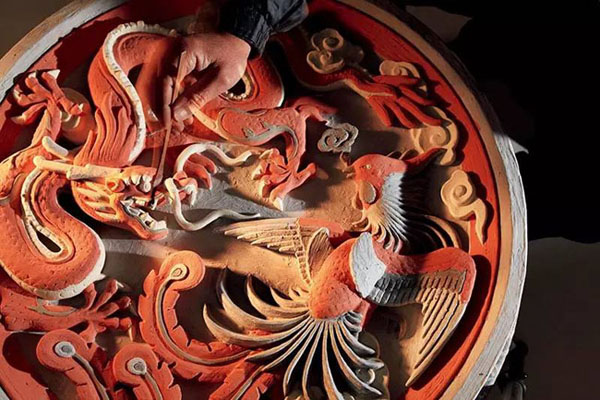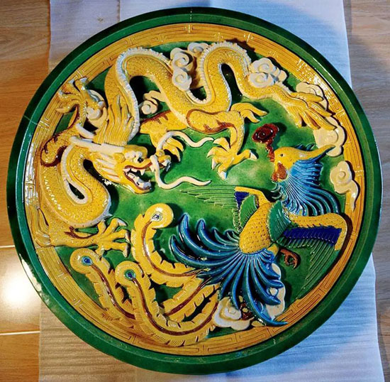 琉璃制品中,常常會(huì)有用于影壁等處的大型裝飾構(gòu)件。這張龍鳳大盤工藝精致,用色多達(dá)七種,有龍身的黃、背景的綠、靈芝的紫、祥云的白、鳳翅羽的藍(lán)、鳳頸的孔雀藍(lán)、鳳眼的黑。最奇妙的是,施釉前的顏色(上圖)與燒成的顏色(下圖)完全不同,讓人對(duì)傳統(tǒng)工藝的神奇變化油然而生敬佩之心。
